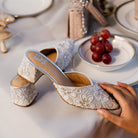 Shine with subtle elegance. This silver-based heel is adorned with delicate floral embroidery in matching tones, adding a soft, graceful sparkle. Ideal for weddings or evening soirées- pair it with silver-toned outfits or pastel ensembles for a timeless look.