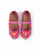 Bright, bold, and full of bloom. This kids ballerina comes alive in a vibrant pink base, adorned with colorful 3D floral details for a fun, eye-catching finish. Perfect for little feet that love to stand out and spin in style.