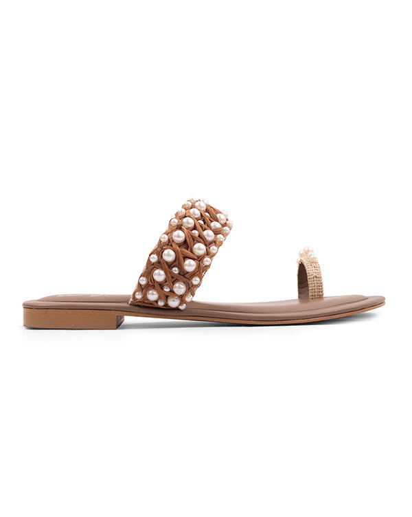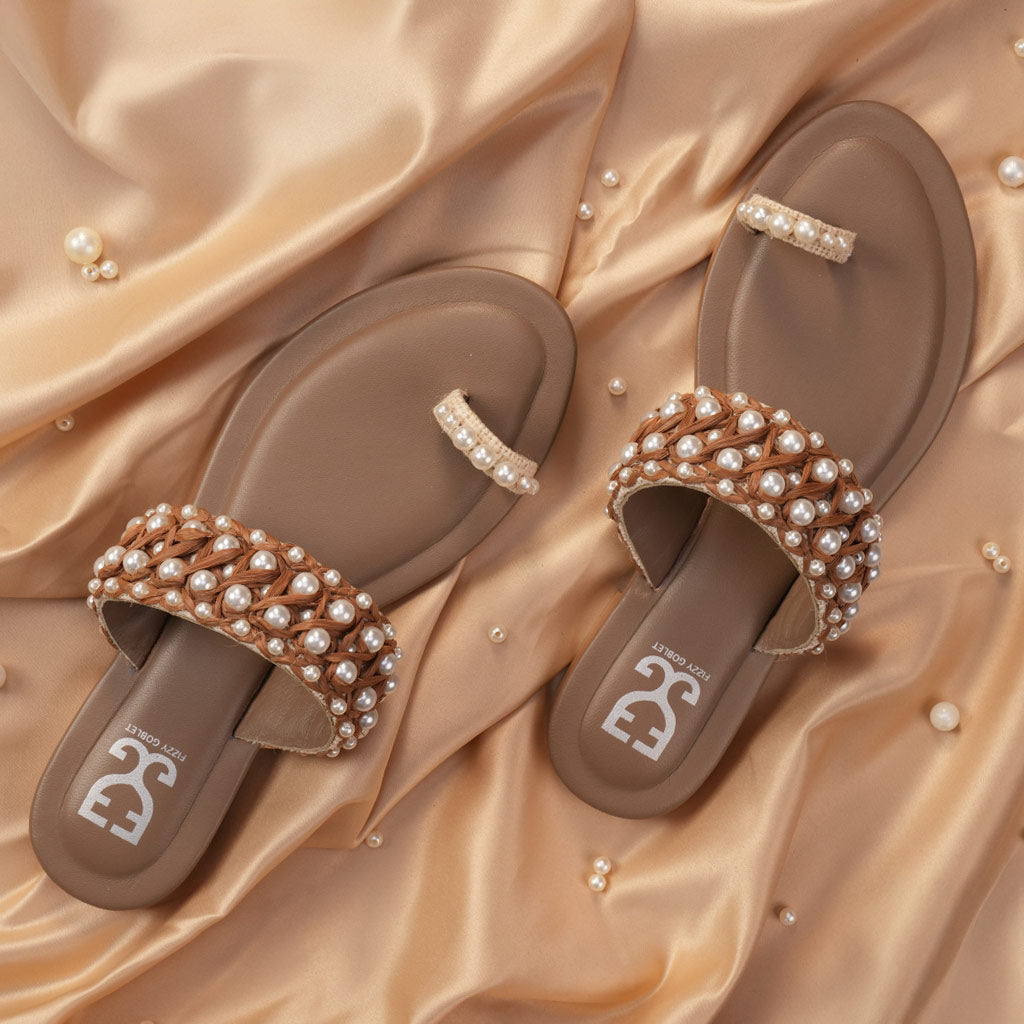 These handcrafted kolhas feature brown raffia intricately entwined with lustrous pearls, creating a delicate and artisanal design. Lightweight and breathable, they offer both comfort and elegance for everyday wear or festive occasions. A timeless pair that blends traditional craftsmanship with subtle sophistication.